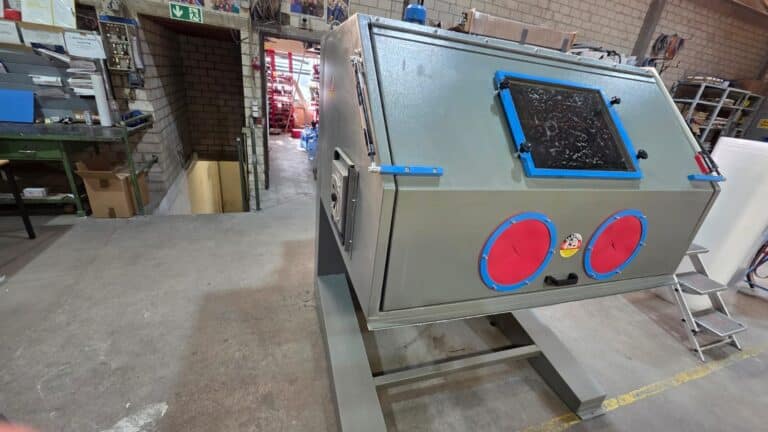 Die Super-Baby Injektor-Tisch-Strahlkabine, gefertigt aus stabilem Stahlblech, kommt mit einer angebauten Staubfilteranlage und automatischem Strahlmittelumlauf. Die Geräte der Modellreihe Super-Baby haben eine große, nach oben zu öffnende Schwenktür, die den Strahlraum zum mühelosen Einlegen der zu strahlenden Werkstücke freigibt. Sie entsprechen den Anforderungen der DIN EN 292 und anderen relevanten Standards, was die Sicherheit und herausragende Qualität unterstreicht.